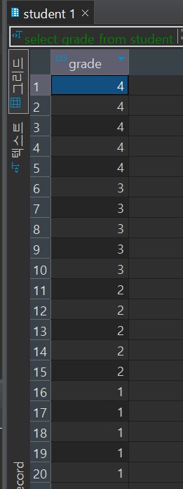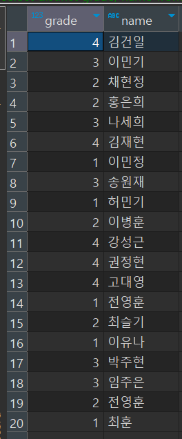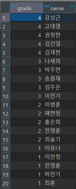 grade, name 컬럼의 모든 값이 중복될 경우에만 생략한다.